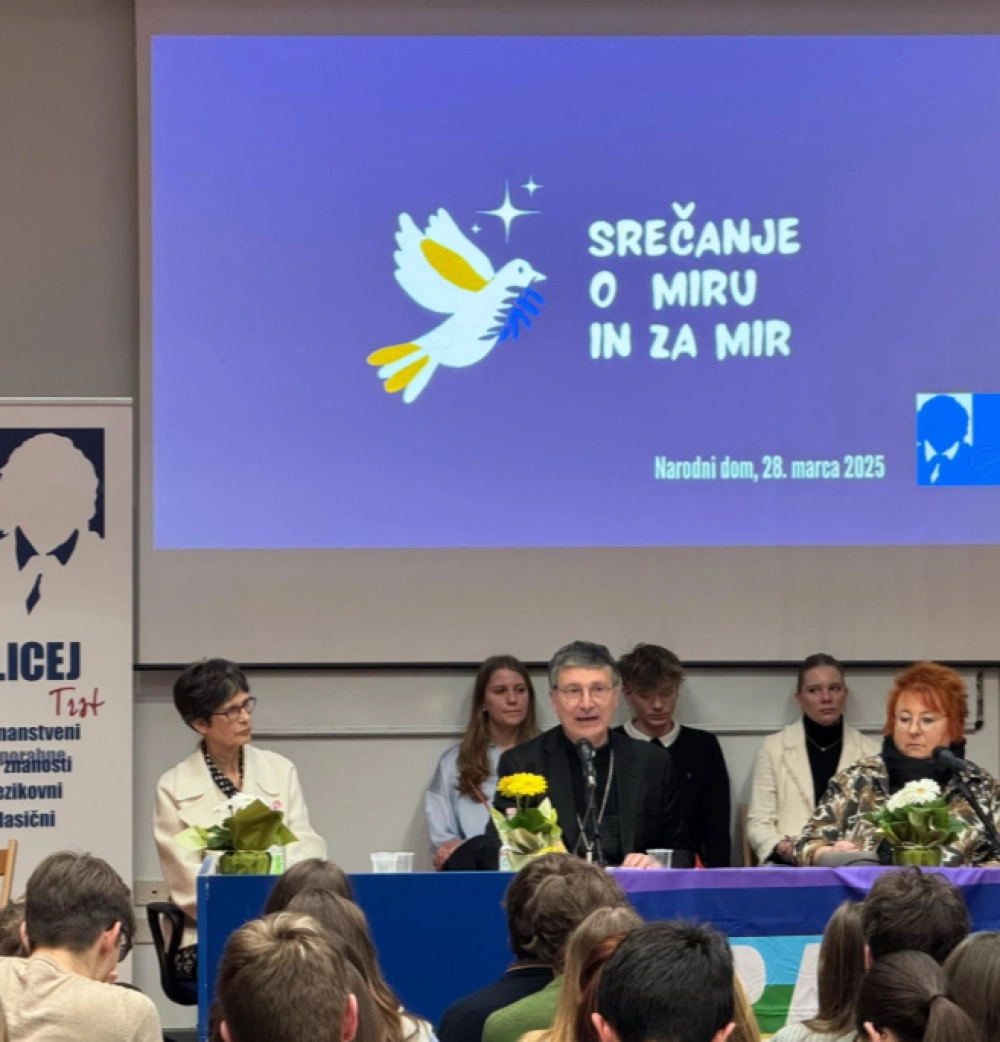 V petek, 28.3.2025, je v Narodnem domu v ul. Filzi potekalo srečanje o miru in za mir, ki so ga priredili dijakinje in dijaki liceja v sodelovanju s profesoricami in profesorji in z dvema uglednima gostoma: gospo senatorko Tatjano Rojc in tržaškim škofom msg. Enricom Trevisijem.