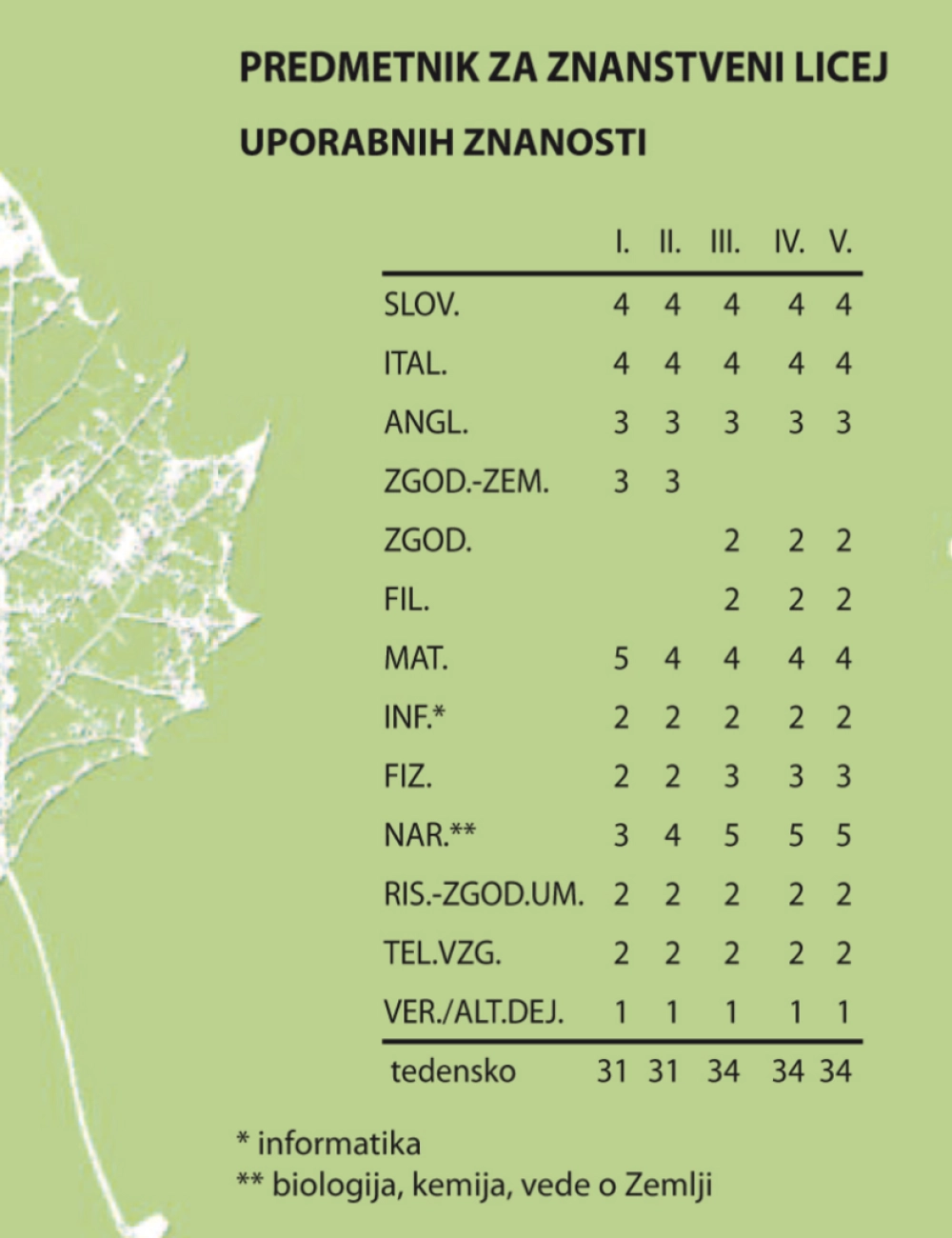 Predmetnik na liceju uporabnih znanosti: